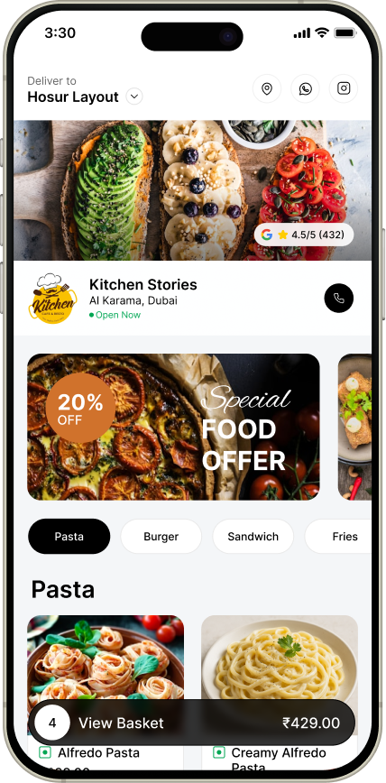 Go live on your tables with QR codes, and on Instagram, WhatsApp, and Google Business with your unique ordering link.